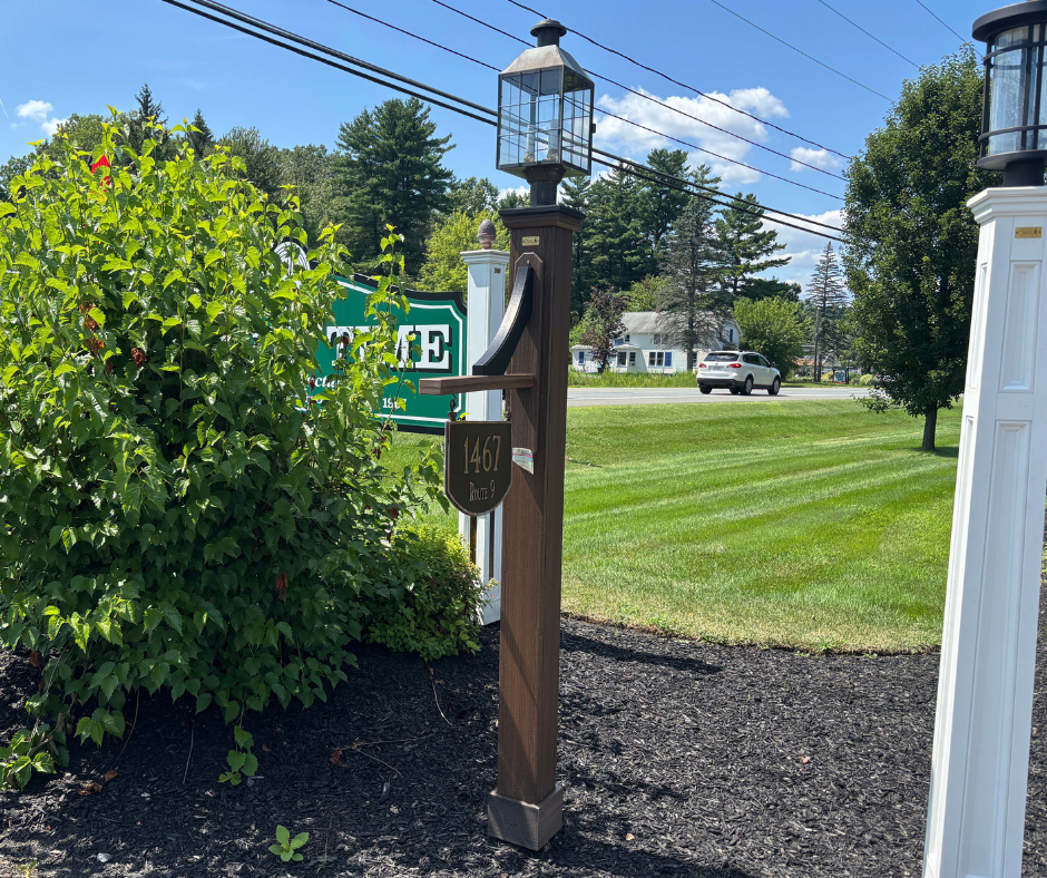 SPRING FIELD LAMP POST (450) - BRAZILIAN WALNUT, AMERICAN HERITAGE LANTERN(380), SIGN BRACKET(85) - VINYL, PRESTIGE ARCH SIGN(210)